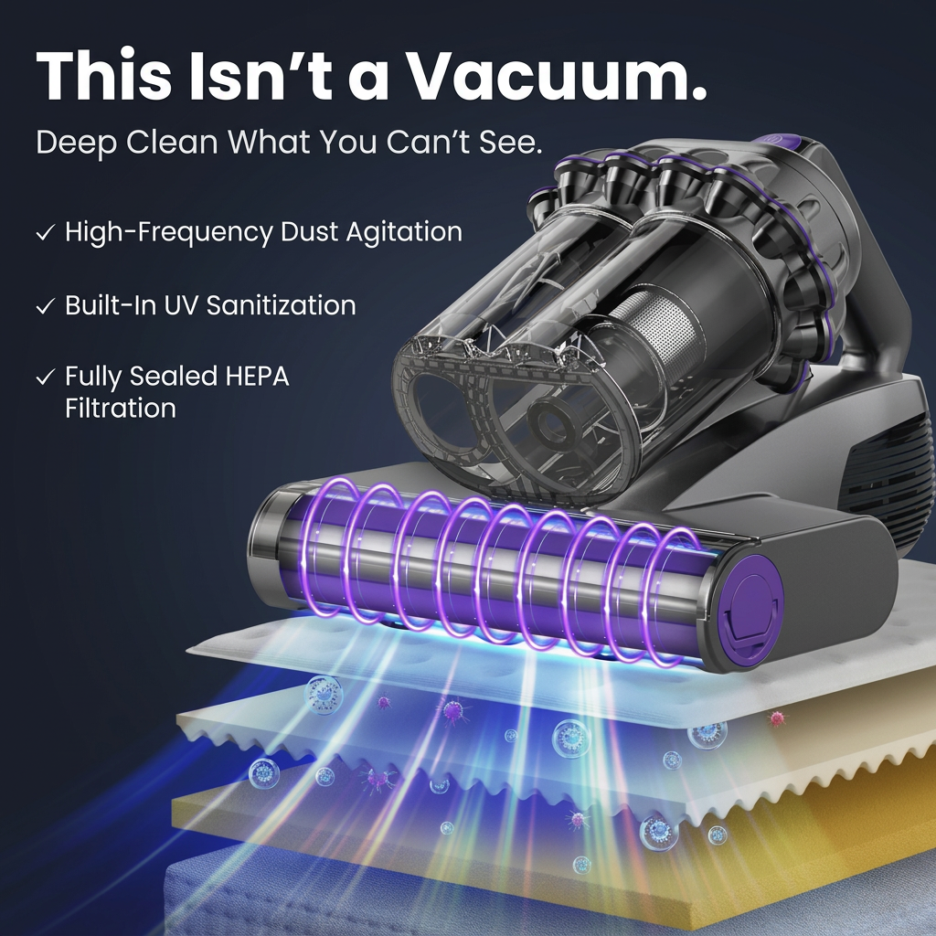 This device combines powerful suction with UV-C light and heat support to help lift dust, debris, and buildup from fabric surfaces like mattresses and upholstery.